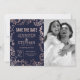 Faire-part de mariage élégant, moderne et chic avec motif floral bleu marine tendance et or rose faux, dessiné à la main. Ce design classique et sophistiqué est parfait pour le couple qui se marie, tendance et élégant. Personnalisez avec votre propre message sur le devant ainsi qu'un monogramme personnalisé au dos. Conception d'impression photo.