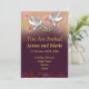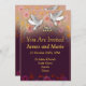 Faire-part de mariage élégant avec colombes et anneaux violets. nom, heures, dates et lieu entièrement personnalisables selon vos besoins
