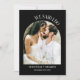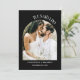 Modèle de carte de faire-part de mariage à calligraphie noire et blanche élégante avec une typographie écrite à la main en forme d'arche avec des volutes qui dit "nous avons dit oui" avec vos noms. Ajoutez deux images à ce produit pour le personnaliser. La photo sera placée au verso de la carte, accompagnée de votre photo de mariage et de votre message souhaité.