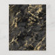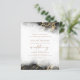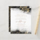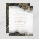 Cette élégante invitation de mariage présente un design de bordure en aquarelle noire en imitation de marbre veiné avec de la fausse feuille d'or, s'estompant graduellement dans l'arrière - plan blanc. Le mot "mariage" apparaît dans un script d'écriture manuscrite de couleur or, le texte restant étant en chapiteaux serif de couleur or. La motif en marbre noir et or est répétée au dos de la carte.