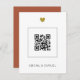 C'est la façon idéale de faire savoir à vos amis et à votre famille que vous allez bientôt vous marier. Ajoutez le code QR pour votre site web de mariage. Si vous n'avez pas encore de code, il existe de nombreux sites en ligne qui peuvent vous donner un code gratuitement. Vous le lierez à l'URL de votre site web. Ensuite, apportez le code ici et téléchargez-le. Ajoutez vos noms et, au verso, un court message personnel.