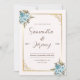 Cette carte de faire-part de mariage avec date de réservation esthétique et personnalisable présente un bouquet floral aquarelle bleu mélangé avec une bordure décorative dorée, associé à une police calligraphique élégante.