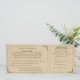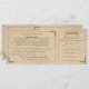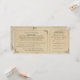 Cette invitation de mariage imprimée dans le style d'un vieux billet en papier parchemin incorpore également une carte-réponse RSVP détachable. Des cadres simples aux coins arrondis sont accentués de volutes de feuilles décoratives, ornées et vintage. Les noms de la mariée et du marié ainsi que le titre de la réponse RSVP sont également mis en valeur avec des volutes décoratives. Au verso, l'adresse de retour peut être ajoutée à la réponse RSVP et d'autres détails sur le mariage à la partie invitation. La ligne de coupe pour la carte-réponse est indiquée au dos de l'invitation par une ligne pointillée pâle et une image de ciseaux.