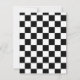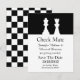 Faire-part de mariage noir et blanc Save The Date réalisé dans un thème de jeu d'échecs. Les silhouettes d'une pièce d'échecs blanche Reine et Roi ornent la partie supérieure noire de l'annonce, avec la partie inférieure réalisée en blanc. Le dos est fait dans un motif à carreaux noir et blanc. Le texte en noir est prêt à être personnalisé avec vos informations de mariage. Superbe annonce pour le couple aimant les échecs.