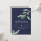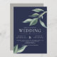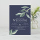 Un superbe faire-part de mariage pour les couples à la recherche d'un look moderne et épuré, avec des feuilles vert aquarelle sur fond marin et une police moderne blanche. Le support est en gris solide mais il peut être retiré.