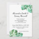 Un faire-part de mariage minimaliste en feuille de monstère pour une soirée à thème tropical. Peut être customisé en toute occasion