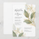 De magnifiques feuilles aquarelles jumelés avec feuilles couleur or titre ce faire-part de mariage moderne.