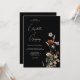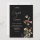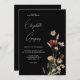 Faire-part de mariage Boho noir avec de beaux fleurs sauvages aquarelle sur arrière - plan noir et écriture de script fantaisiste. Design simple et minimal.