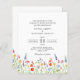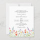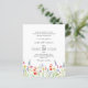Une faire-part de mariage minimaliste simple, fleurie et colorée. Sur un arrière - plan blanc, la bordure est décorée de beaux fleurs sauvages d'aquarelle rose, bleu, rouge, jaune et violet, à côté de la verdure et du feuillage. Personnalisez en ajoutant tous les détails de votre événement.
