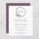 Cette conception de mariage présente les initiales du monogramme de la mariée et du marié en violet encadrées par une couronne de fleurs de lilas et de violettes et de feuillage vert peinte à l'aquarelle. Personnalisez le texte avec les noms des mariés en élégante écriture manuscrite violette et les détails du mariage en gris charbon. Le verso est d'une teinte violette unie.