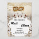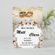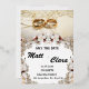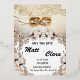 Faire-part de mariage élégant avec des anneaux d'or entrelacés sur un fond de dentelle délicate, encadré de décorations florales. Le faire-part annonce le mariage de Matt & Clara, prévu pour le 5 août 2030, à 20h00 à l'hôtel Liceria, 123 Anywhere St. Le design allie des éléments classiques et romantiques, ce qui le rend parfait pour une occasion spéciale.