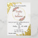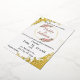 C'est un faire-part de mariage magnifiquement conçu pour Teddy et Juliana. L'invitation présente un thème floral avec un cadre géométrique or délicat entourant les noms du couple dans une police de script élégante. En haut, une bannière verte au texte blanc indique, L'arrière - plan est orné d'un feuillage vert doux et de éclats dorés, ajoutant une touche sophistiquée et naturelle. L'invitation se termine par "Réception à suivre" dans une police cursive.