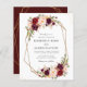Un design floral rouge bordeaux et roux avec un cadre géométrique avec du texte au milieu. Vous pouvez modifier le libellé, la taille du texte, la couleur et la police de ce modèle faire-part de mariage.