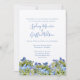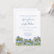Simples invitations de mariage avec bordure florale bleue de la ligne "Bella Blue". Le papier ecru flt est affiché, avec d'autres options disponibles. La carte a un script bleu et des polices imprimées, avec une large bordure inférieure de bourgeons hydrangéens réalistes. Les fleurs bleues ne font qu'ouvrir avec beaucoup de centres jaunes-verts qui apparaissent. Le libellé de l'exemple commence par "L'honneur de votre présence est demandé", avec des noms en gros caractères en dessous. Tous les renseignements sur la cérémonie et la réception se trouvent sous forme de paragraphe et peuvent contenir une adresse de réception si nécessaire. Ajoutez des espaces entre les lignes au gré de votre choix.