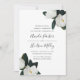 Faire-part de mariage florale élégante et gracieuse, avec des fleurs de magnolia blanches chic et des feuilles vert foncé aux coins, encadrant vos détails mariages dans des caractères manuscrits, blocs et italiques. Les invitations se retournent vers le vert riche.