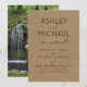 Cette invitation de mariage belle et moderne avec calligraphie et typographie Kraft pour une fête de célébration de mariage comporte un script calligraphié noir et blanc et une invitation de conception de police sans empattement en majuscules modernes sur le devant, et une photo couleur d'orientation verticale de votre mariage au dos.