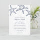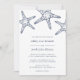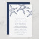 Le design moderne des faire-part de mariage côtières comprend trois illustrations vintages d'étoiles de mer en haut, encadrant vos détails mariages dans un mélange chic de typographie serif classique et sans serif moderne. Un design élégant d'invitation de mariage en bleu marine et blanc intemporel pour les mariages nautiques, d'été ou de plage.