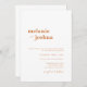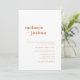 Cette faire-part de mariage simple et moderne comprend une palette de couleurs en cuivre orange et blanc, une police serif audacieuse pour les noms des couples, une police sans serif élégante et classe pour le texte du faire-part de mariage, et une police de script manuscrite charmante pour une touche d'élégance supplémentaire.