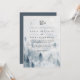 Élégante invitation de mariage hivernal, un arrière - plan d'aquarelle représentant un paysage de montagne enneigé parsemé de pins dans les nuances brumeuses de bleu et de gris. Personnalisez avec vos détails mariages en lettrage doux et doux, surmonté de votre monogramme ou de votre duogramme, accompagné d'un esperluette décoratif. Un beau choix pour des mariages d'hiver élégants en montagne ou en forêt.