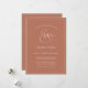 Simple Faire-part de mariage Monogramme en terre cuite. Impressionnez vos invités mariages avec cette faire-part de mariage orange brûlée branchée avec un magnifique script blanc, avec les initiales de la mariée et du marié sur un arrière - plan en terre cuite. Cette Invitation a un superbe design orange foncé, avec des vibes modernes et minimes, parfait pour votre mariage simple, tendance et minimaliste. La disposition minimale et moderne attire l'attention sur le script initial, en contraste avec l'arrière - plan en terre cuite. Cette invitation donnera le ton d'un beau cadre mariage, entouré de fleurs orangées neutres ou brûlées, et d'un décor mariage en terre cuite assorti. Un complément parfait à toute célébration sobre et élégante. Le Collectif du dimanche © par Rachel Hannah Gee