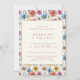 Doté d'une bordure d'aquarelle vibrante de fleurs sauvages dessinés à la main dans les tons bleu, corail, jaune et rose roux. Le design entoure un centre de crème fraîche où les détails de l'événement sont présentés dans des polices serif modernes. L'aménagement épuré et les motifs floraux vifs marient le raffinement contemporain au charme romantique, ce qui en fait une invitation idéale pour les fêtes de printemps, d'été, de jardin ou de bohème. Le dos reste propre pour des détails supplémentaires ou une note personnelle, assurant à votre faire-part un sentiment à la fois joyeux et intemporel.