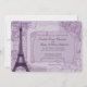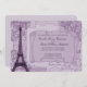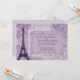 Invités Invitations à votre prochain mariage avec un Faire-part de mariage parisien violet. Le design de l'invitation comprend la Tour Eiffel, un parchemin où vous pourrez détailler l'information de votre douche nuptiale ornée de damas et d'embellissements de timbre postal. Papier à lettres mariage supplémentaire disponible avec cette conception aussi.