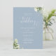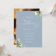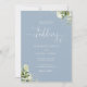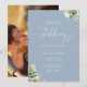 Cette élégante invitation de mariage florale verte poussiéreuse bleue peut être personnalisée avec les détails de votre célébration dans une typographie chic et votre photo spéciale au verso. Conçue par Thisisnotme©