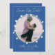 Annoncez la date de votre mariage à votre famille et à vos amis avec cette carte de sauvegarde de date de mariage photo conçue avec des cœurs dorés sur fond bleu. Pour la personnaliser, remplacez simplement la photo par votre image préférée en utilisant notre modèle. Cliquez sur AJUSTER ou REMPLIR pour couvrir l'espace et assurez-vous de centrer dans le cercle. Ensuite, insérez votre texte dans le modèle, en remplaçant les noms et la date de l'exemple. Le texte de couleur dorée au recto comprend : Sauvegarder la date, les prénoms de la mariée et du marié et la date du mariage.