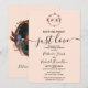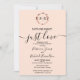 Une simple invitation de mariage chic avec feuillage, monogramme en feuille d'or rose et rose pêche. Facile à personnaliser avec vos détails. Invitation de mariage moderne boho modifiable, invitation de mariage avec photo et couronnes, personnalisable, police manuscrite calligraphiée, simple, élégante.
