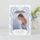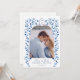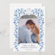 Carte élégante et unique de faire-part de mariage avec peinture à main aquarelle Fleurs et feuilles Delft bleu et blanc entourant un cadre en arche avec photo de couple