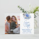 Immortalisez votre amour avec ce faire-part de mariage photo élégant avec des floraux doux bleu poussiéreux. Un choix romantique et intemporel pour les mariages de printemps, de jardin ou classiques. Ajoutez votre photo préférée pour une touche personnelle à votre annonce.