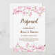 Modèle de faire-part de mariage reporté à l'aquarelle Cerisiers en fleurs. Ce design présente des fleurs de cerisier sakura roses pour lesquelles le Japon est célèbre. Pour une personnalisation plus poussée, veuillez cliquer sur le bouton "Personnaliser" et utiliser notre outil de conception pour modifier ce modèle. Tous les styles de texte, couleurs et tailles peuvent être modifiés pour répondre à vos besoins.