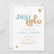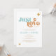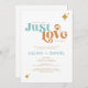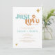 Ce faire-part de mariage rétro décontracté Just Love est idéal pour les couples modernes et simples qui aiment tout ce qui est rétro. La palette de couleurs de bleus, de jaune moutarde et d'orange miel donne une ambiance très décontractée et balnéaire.