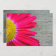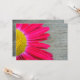 Une faire-part de mariage amusante et vibrante avec une photo d'une marguerite rose chaud qui regarde de gauche au-dessus d'un arrière - plan de bois d'écorce. Le côté opposé est constitué d'un arrière - plan en bois d'écorce avec du texte au centre dans un rectangle blanc surligné de rose chaud correspondant à la marguerite. Personnalisez avec les détails de votre événement. L'écriture est celle des parents de la mariée.