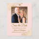 Faites savoir à vos amis et à votre famille de réserver la date de votre mariage à venir avec ce faire-part simple mais élégant. Il présente un beau design avec du texte doré sur un fond rose pâle et votre photo entourée de dentelle dorée filigranée. Au verso, un graphique mignon indiquant "réservez-nous" et un espace pour une note personnalisée.