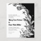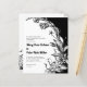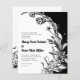 Présentant un faire-part de mariage fleuri de style vintage et économique, avec des fleurs d'art noir et blanc et une typographie élégante. Au dos, il y a un code QR pratique pour RSVP en ligne. L'invitation présente une charmante guirlande vintage à fleurs, noire et blanche, contre un arrière - plan blanc.