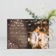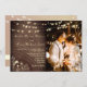 Célébrez votre amour sous la lueur des lampes à cordes avec ce faire-part de mariage en bois rustique avec des illustrations florales dorées romantiques, des lumières scintillantes, et une photo personnalisée du couple. Un code QR pratique relie les invités directement à votre site Web mariage ou à votre page RSVP. Des polices de caractères élégantes et des tons terreux en font le choix parfait pour les mariages d'automne ou d'hiver avec une atmosphère rustique moderne et confortable.
