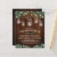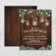 Faire-part de mariage rustique verdure abordable avec un fond de grange en bois sombre, feuillage d'arbre vert, lumières de jarres mason en guirlande, fleurs de bébé respirant et un modèle de mariage moderne éditable.