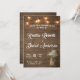 Invitation de mariage rustique avec pot en matière et fleurs de bébé respiration, arrière-plan de grange en bois et guirlandes lumineuses. Modèle de faire-part de mariage bohème, campagne, extérieur. Carte de mariage rustique romantique, modifiable et personnalisable.
