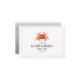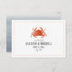 Un faire-part de mariage nautique rustique avec une illustration d'un crabe rouge avec du texte gris et des rayures épinglées rouges délavées sur le devant. Le dos présente un design inspiré du chambray à l'aquarelle.