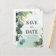 Élégantes cartes de faire-part de mariage vertes avec un fond à l'aquarelle délavé rustique, des feuilles d'eucalyptus botaniques, des éclaboussures de feuille d'or faux et un modèle d'annonce de mariage simple facile à personnaliser.