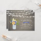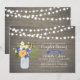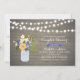 Une invitation rustique de mariage pour couples avec un bocal en maçonnerie, des fleurs violettes et jaunes, et des guirlandes lumineuses sur un fond en bois.