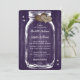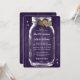 Faire-part de mariage violet rustique avec un bocal de maçon et des coeurs de burlap sur un arrière - plan de bois de grange.