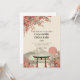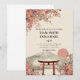 Ce faire-part de mariage présente un paysage japonais avec une structure traditionnelle entourée d'arbres sakura et une montagne en arrière-plan.