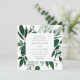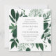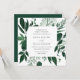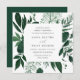 Notre faire-part de mariage Wild Forest dans un format carré unique encadre vos détails mariages avec une bordure de feuillage aquarelle peinte dans les tons hivernaux de la forêt et le vert chasseur. Un choix moderne mais bio pour les mariages d'hiver ou de printemps.