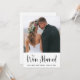 Ces faire-part de mariage simples et élégants et invitations à la fête après le mariage présentent votre photo personnelle sur le devant, avec une écriture manuscrite noire tendance qui dit "nous sommes mariés". Il y a de la place pour ajouter vos noms et la date. Un look frais et moderne qui est le moyen idéal pour informer vos amis et votre famille que vous êtes mariés, et les inviter à votre fête de célébration après le mariage.