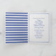 Faire-part de mariage plié dans un style nautique bleu et blanc. Un fond texturé blanc est accentué par un cadre bleu moyen. Le devant de la carte comporte des graphiques d'une ancre dorée et l'intérieur gauche a un motif rayé bleu et blanc. Personnalisez tout le texte pour votre mariage.