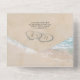 Une invitation de mariage de destination de plage 3 en 1 comprenant un fond d'île tropicale estivale, une plage de sable vintage avec deux cœurs sur le rivage, vos initiales, les détails du mariage, l'invitation et une carte de réponse RSVP de menu pour que vos invités la détachent et la renvoient.