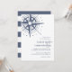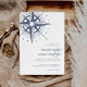 Faire-part de mariage chic côtier avec une illustration de compas dessinée à la main de style vintage en haut à gauche dans un bleu de port délavé, avec vos détails de mariage en bleu marine classique. Parfait pour les mariages sur la plage, en été ou sur le thème nautique, ces faire-part de mariage de style côtier sont imprimés sur des bandes larges bleues et blanches.
