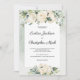 Il s'agit d'un faire-part de mariage bohème de style boho avec feuillage verdoyant et eucalyptus avec roses blanches et étincelles de parties scintillant or
